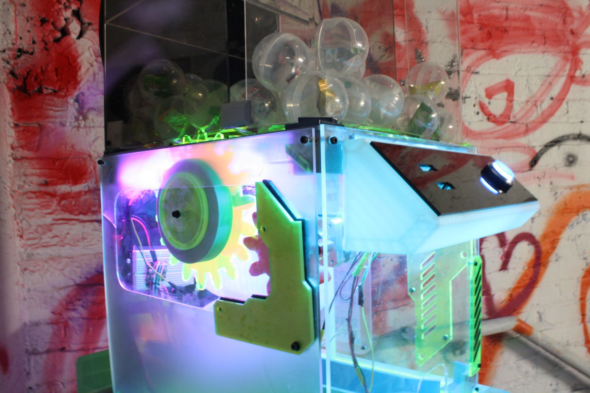 An interactive gachapon machine that dispenses sculptural toys featuring an embedded videogame.